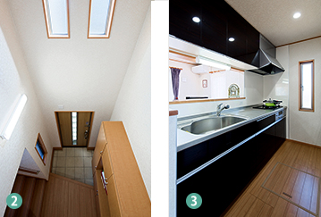 ❶大きな開口から明るい日差しに包まれるLDK。お子さんが、おもちゃを並べて遊んだり、元気いっぱいに走りまわっても充分余裕のある広さを確保。家族がくつろぎながら、のびのびと過ごすお子さんの成長を見守る暖かな空間となっている。キッチンカウンター横には、大きめの収納を設け日常的に使うものをたっぷり収納できるのでLDはいつもスッキリ。仕切りの引き戸を開放して和室と一続きにすると、約26畳の広々空間となる。和室には、玄関ホールへと繋がるもう一つの出入り口を用意。リビングを通らず洗面室や浴室に行くことができるので、来客のための個室としても便利に使える。❷吹き抜けの玄関ホールから階段、トイレ、洗面室、LDK、和室へそれぞれダイレクトにアクセスでき、効率的な動線を考慮したプランニング。暗くなりがちな玄関ホールや2階ホール、廊下にも光を採り入れ、爽やかな快適さを感じられる住まいに。❸黒でシックにまとめた機能的で使いやすいキッチン。手前には広く取った洗面室・浴室へつながるドアがあり、キッチンと水回りを並列に配置。玄関からリビングを通らずにキッチンに入ることも可能な使い勝手のよいプランだ。❹2階の寝室。バルコニーに面した南向きの窓からは、温かい日差しが入る。クロゼットと物入れの2つを備え収納力も充分に確保。❺広々としたバルコニーは、Tさんの要望で2階の3つあるすべての部屋から出入りできる配置に。バルコニーから各部屋へ光や風を採りこむ快適性とともに、洗濯物の取り込みや収納などにもスムーズな動線を実現している。